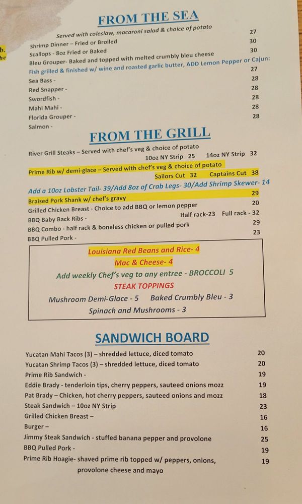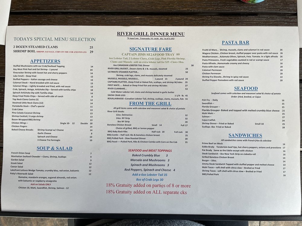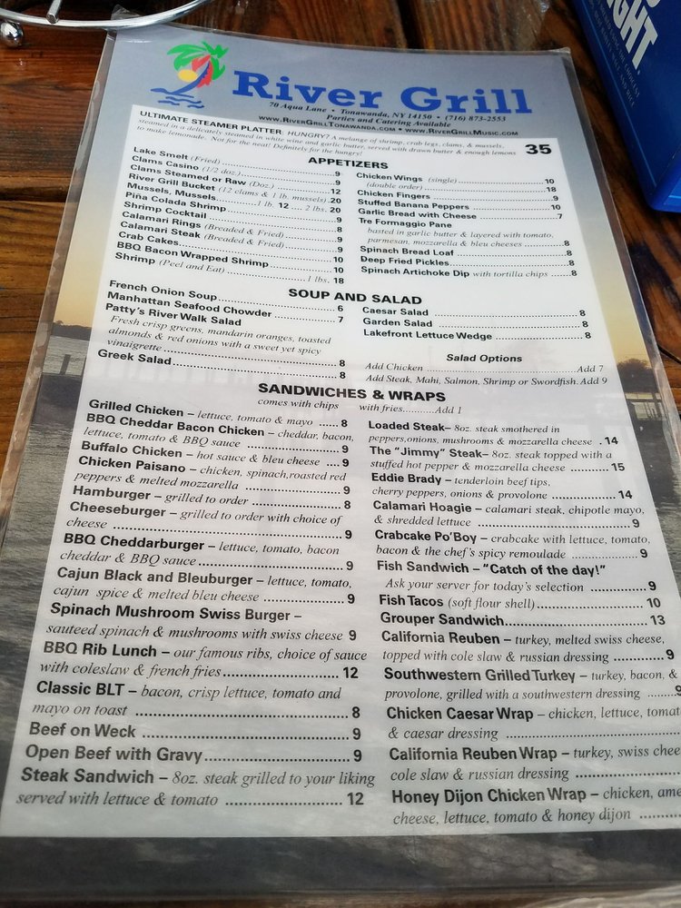 Introducing "River Grill," a seafood restaurant located in Tonawanda, NY, offering a casual dining experience with a tropical vibe. Known for their delicious seafood dishes like seafood paella and the River Bucket loaded with shellfish. The menu boasts a variety of options including appetizers like White Truffle Macaroni and Cheese, salads like Candied Almond and Strawberry Salad, and sandwiches like Grilled Chicken Ranch. Customers rave about the fresh and flavorful food, with reviews mentioning attentive service and a diverse selection of dishes to please everyone in your group. Enjoy the outdoor seating, live music, and relaxing atmosphere at River Grill while savoring their tasty meals. Make a reservation or order for takeout to experience the flavors of this seafood haven.